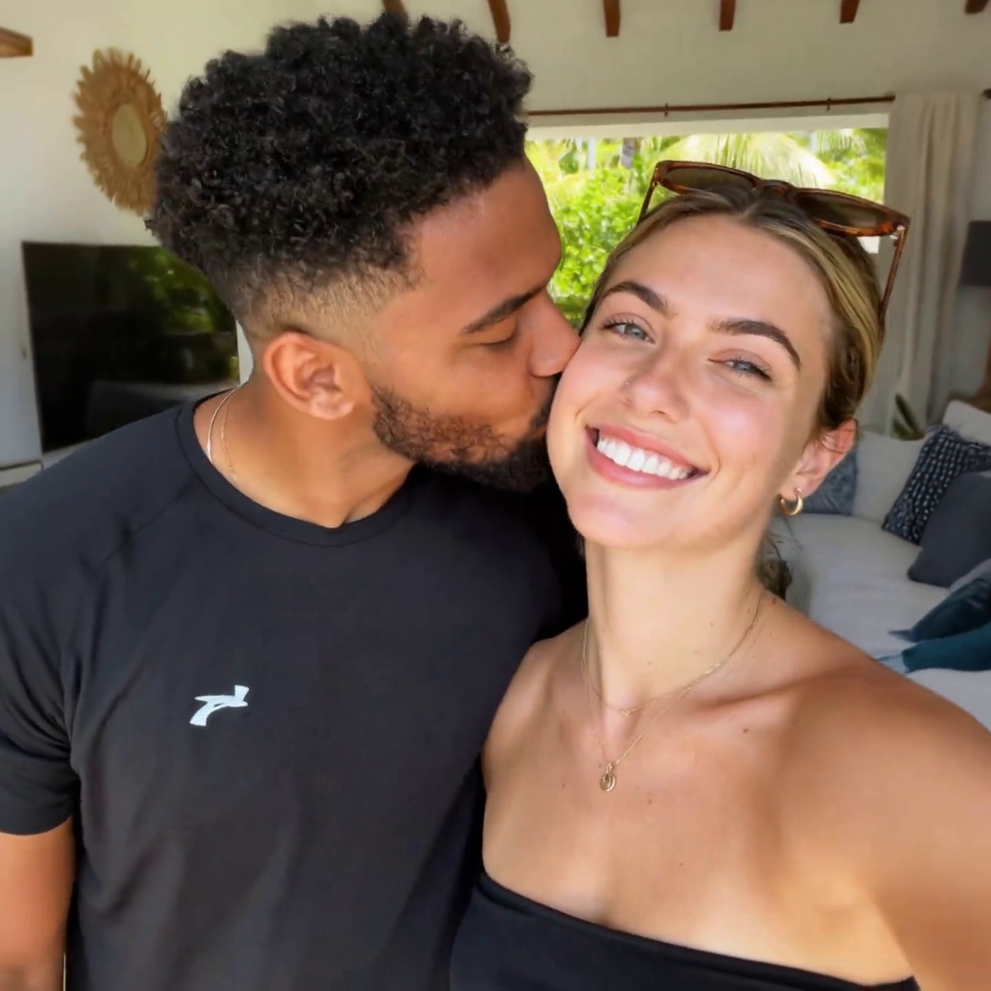 The camera remained stationary. After the figures in the scene moved closer to each other, the person on the side turned her head towards the middle figure and kissed the cheek of the middle figure. The person whose cheek was kissed remained still and looked at the camera, instantly revealing a happy expression. A warm scene, with all the main characters maintaining their original facial features, clothing and background. The movements were smooth and natural, the details were realistic, and it had a cinematic appearance.