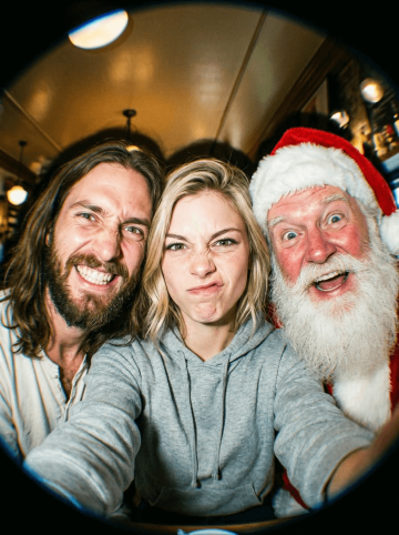 Subject & Action: A close-up, distorted group photo featuring [Person From Uploaded Image] taking selfie with Jesus and Santa Claus. Everyone is making wild, exaggerated faces, squinting slightly from the flash.
