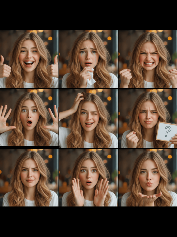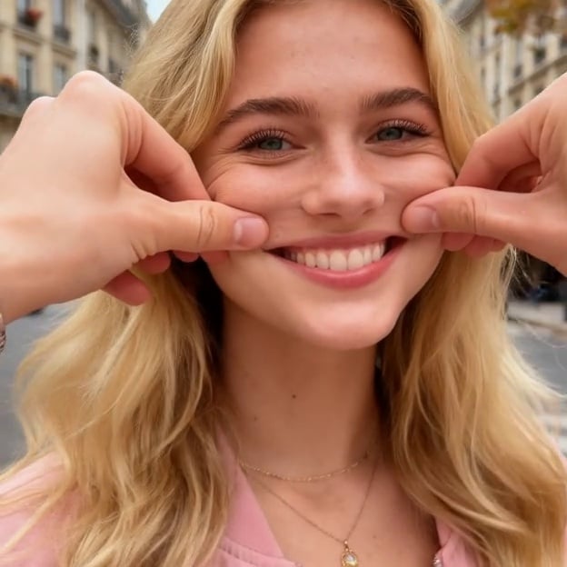 Fixed shot. On both sides of the frame, two hands extend out (in a natural position, with the backs of the hands facing outward and the palms facing downward). The hands pinch the sides of the protagonist's face, with the remaining fingers naturally bent. The hand posture creates an interactive sense of "gentle pinching and pulling", and the movement is playful and expressive. Pinch the face, lift it upward at an angle. Facial state: The cheeks have deformed due to the pinching and pulling, and the mouth also undergoes deformation. Combined with a natural smile, a lively and adorable expression is presented, adding a dynamic texture. Maintain consistency of the subject, and focus the camera on the protagonist's face.