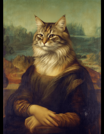 Exact same painting style, lighting, aged varnish, and canvas texture as the uploaded Mona Lisa; replace the human figure with a dignified long-haired cat—serene expression, subtle smile, matching head tilt. Both human hands must become fluffy cat forepaws, positioned exactly where the original hands were, with natural feline anatomy and seamless brushwork blend. No modern elements, ultra-sharp 8 K.