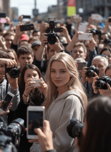 Ultra realistic candid photo of a (as in reference), standing in a crowded place with people holding cameras and taking photos. The background is filled with fans and a little chaos of crowd, giving a true celebrity vibe. The photo should look like a real-life captured moment, with natural lighting, sharp details, and authentic atmosphere.