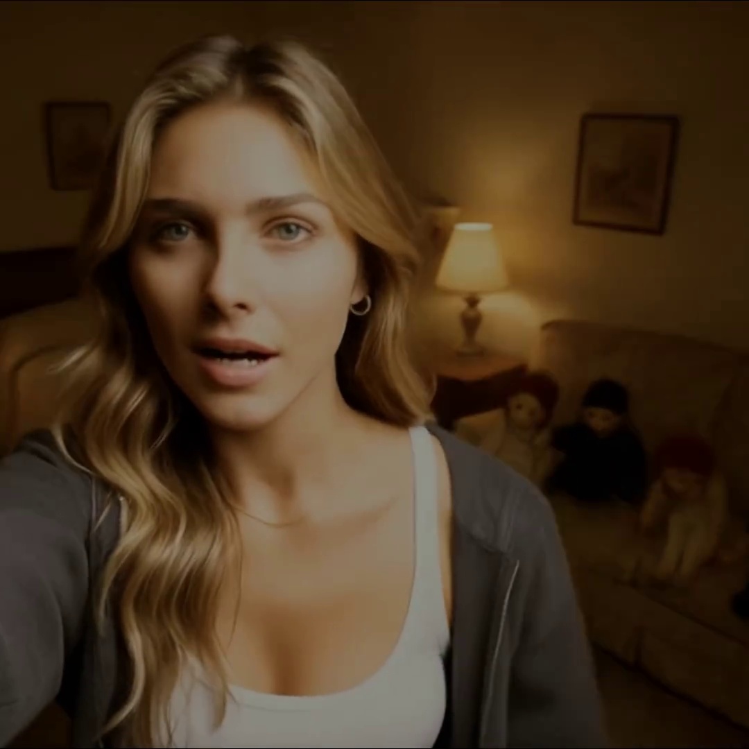 The camera follows the movement of the character's face. The camera focuses on the character's face. The character maintains consistency. The character always keeps the same posture, with the left hand stretched and placed at the lower left corner of the frame (recording from the first-person perspective). The light from the phone reflects onto the character's face, illuminating a clear face. The character maintains the original posture (left hand at the lower left corner) and runs forward in a fleeing manner (continuing without an end). During the run, the chest shakes. Five puppet figures behind (maintaining the same size as in the original picture) suddenly stand up from the ground, stretch out their arms in the direction of the protagonist, run on the ground, and keep quickly chasing the protagonist (not catching up) (the faces of the puppets are clear). The character's expression is tense. The character is in front, and the puppet is behind. The atmosphere of the suspense short film, and the characters remain in the frame.
