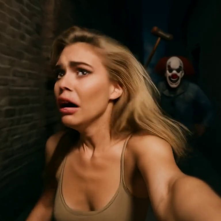 The fixed camera focuses on the character's face. The camera follows the movement of the character, and the character maintains the posture of extending his left hand and placing it at the lower left corner of the frame (maintaining the first-person perspective for recording). The light from the phone reflects onto the character's face, illuminating a clear expression. The character appears nervous. The character keeps running forward at a fast pace to escape (continuing the run without an end). During the run, the chest shakes. The clown behind the character is waving a bloody hammer towards the protagonist, chasing the protagonist rapidly (not catching up) (the clown's clear facial expression shows a terrifying smile, with a split mouth). The atmosphere of the suspense short film, (with light on the face), background sound: breathing sounds from running and running noises.