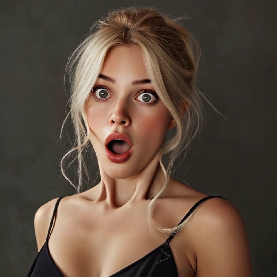 Keep the pose of uploading the original image. The subject's eyes instantly open wide, the pupils slightly dilate, the eyebrows rise into an arc, and the mouth slightly opens to form an "O" shape. The entire face is frozen in an extremely surprised expression for 2 seconds, without any jump cuts or special effects.