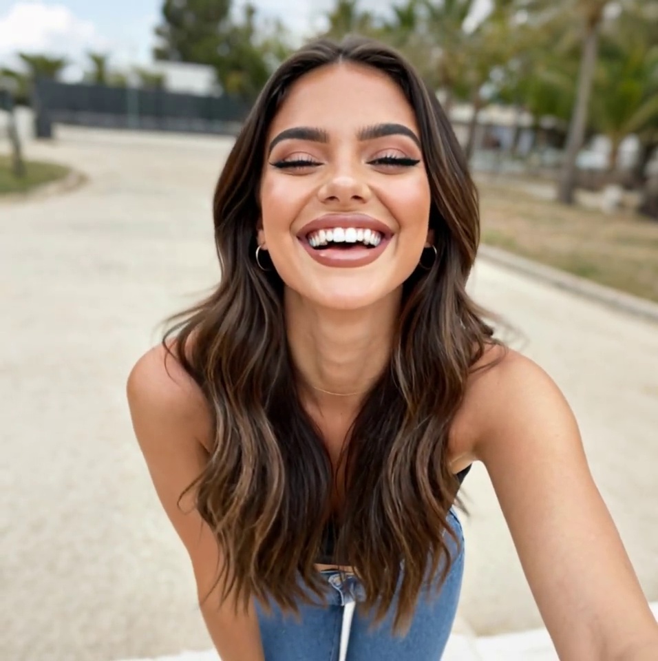 The expression changes naturally and smoothly: first calm and neutral, then gradually turning into a bright, joyful smile, and finally a happy laugh.