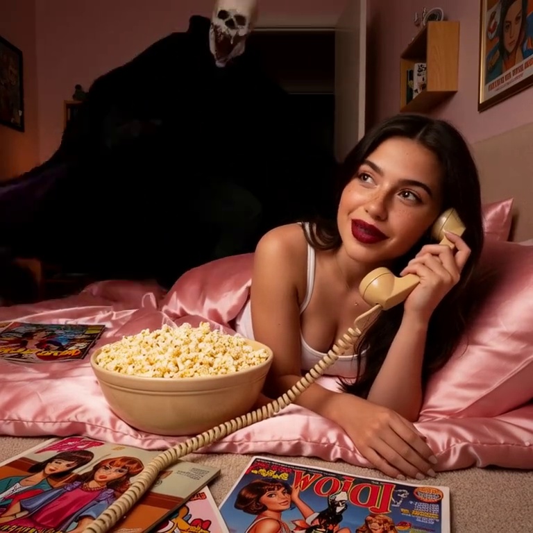 Fixed shot. The protagonist is enthusiastically on the phone while a figure dressed in an all-black cloak and wearing the iconic "Scream" mask quickly enters through the door behind him. The mask has a pale, bone-like texture, with the mouth wide open in a roar-like expression, and the hollow design of the eye sockets and nostrils. Without the protagonist noticing, the figure approaches the protagonist's feet in 0.1 seconds, quickly reaches out and forcibly pulls the protagonist's legs away. The protagonist falls to the bed and is dragged away, disappearing through the door in 0.1 seconds. The empty shot remains for 1 second.