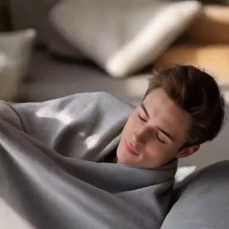 In a fixed middle shot from the front, the character is smiling at the camera with their hands naturally hanging down. The right hand picked up a thick light grey quilt from outside the painting, and the left hand assisted in draping the quilt over the shoulder. The edge of the quilt formed a soft crease at the chest. The figure bends his knees and slowly squats down, with his body naturally tilting to the right. The movement is smooth and seamless, and the hem of the quilt spreads naturally with the force of gravity. The head landed precisely on the pillow, and the pillow surface was pressed down by 2 cm and bounced back. Pull the upper edge of the quilt to your chin with both hands to form a wrapped "cocoon" shape. The eyes moved from half-closed to fully closed, and the eyelashes quivered slightly. The breathing gradually slows down, and the chest rises and falls slightly with the breathing rhythm.