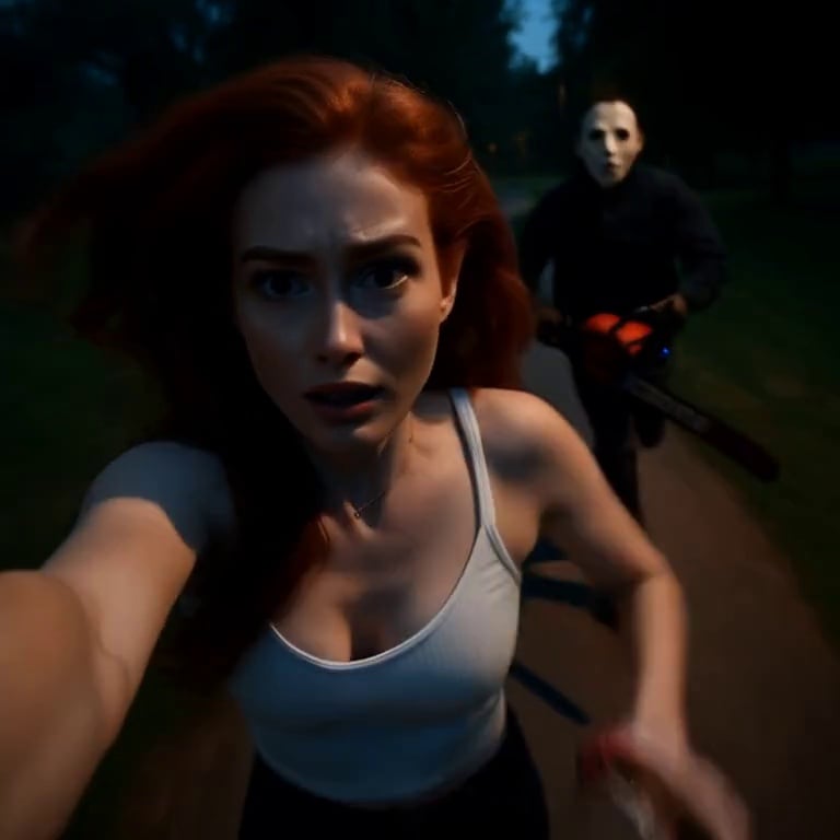 The fixed camera focuses on the character's face. The camera follows the movement of the character, and the character maintains the posture of extending his left hand and placing it at the lower left corner of the frame (maintaining the first-person perspective for recording). The light from the phone reflects onto the character's face, illuminating a clear expression. The character appears nervous. The character keeps running forward at a fast pace to escape (continuing the run without an end). During the run, the chest shakes. The person wearing a mask behind is waving a bloody chainsaw towards the protagonist, chasing the protagonist rapidly (not catching up) (the clear facial features of the mask-wearer, the dark eyes). The atmosphere of the suspense short film. (The face is illuminated by light). Background sound: breathing sounds of running, footsteps, and the sound of the chainsaw.
