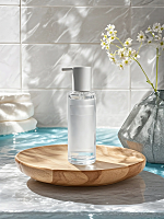 Taking the skin care products in the picture as elements, design a packaging box. The skin care products are placed right beside the packaging box, and both the packaging box and the skin care products stand on the table. The picture is mainly in light green tones, with a solid background and a high-end texture.