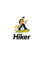 Referring to this pattern LOGO, the brand name is "Hiker", and the pattern logo is printed on packaging bags, headscarves, manuals, metal cards, lanyards, and badges. The main visual color is vibrant orange, featuring a functionalist and durable modern style. Finally, display all the products together.