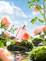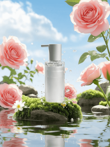 Taking the skin care products in the picture as elements, design a packaging box. The skin care products are placed right beside the packaging box, and both the packaging box and the skin care products stand on the table. The picture is mainly in light green tones, with a solid background and a high-end texture.