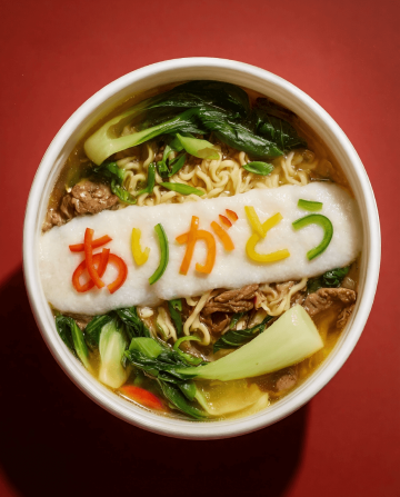 On top of this long yam strip, arrange thin slices of colorful bell peppers to form the Japanese word “ありがとう”.