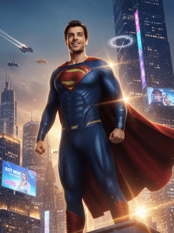 masterpiece, ultra-detailed, cinematic poster,the same man transformed into Superman: classic red-blue costume with metallic S-shield on chest, flowing red cape, heroic stance, confident smile,standing on a glowing skyscraper rooftop at twilight, futuristic neon skyline, holographic billboards, flying cars and energy rings in the background, dramatic rim lighting, particles and lens flares