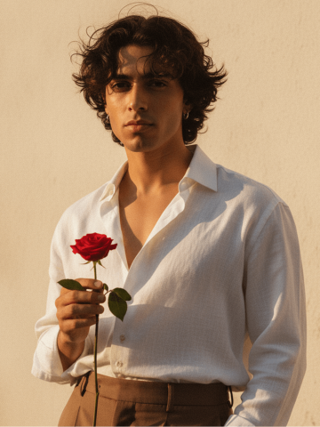 Use the uploaded reference photo as subject. Face, skin, and features must match exactly. Create a vintage 90s movie-style image, bright but grainy. The person wears a white linen shirt and brown tailored pants, hair dark brown, middle-parted, wavy, voluminous, slightly tousled. Holding a small rose delicately. Standing against a minimalist textured wall in a windy scene, shirt and hair subtly moving. Warm golden hour lighting, deep shadows, high contrast. Expression moody, calm, introspective, cinematic. Ensure the person’s appearance is exactly like the uploaded reference.