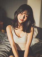 The expression changes naturally and smoothly: first calm and neutral, then gradually turning into a bright, joyful smile, and finally a happy laugh.