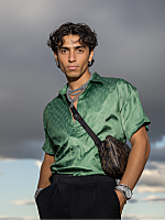 They slightly raise their wrist to show a gold Rolex Day-Date, but their gaze looks directly into the camera with a cool and commanding presence.