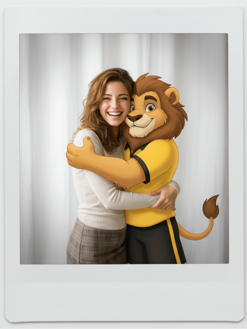 Polaroid 2:3 photo: IMG1 person and IMG2 cartoon character hugging like friends, smiling and laughing, heads close together, looking at the camera, hips-up; original clothes; white-curtain background; cartoon character’s arms naturally around person, proportions adjusted for natural interaction; subtle shadowing for depth; strong flash, slight overall blur, soft light vignette, no omissions; no face-swap, no distortion; classic white-border Polaroid, flat on white table, back flush, 90° top-down, zero tilt, no extras.