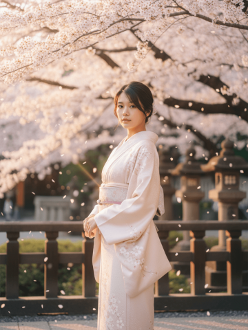 wearing a luxurious pastel kimono: pale silk with subtle sakura embroidery, soft gradient from blush to ivory, wide flowing sleeves, matching obi in dusty rose,