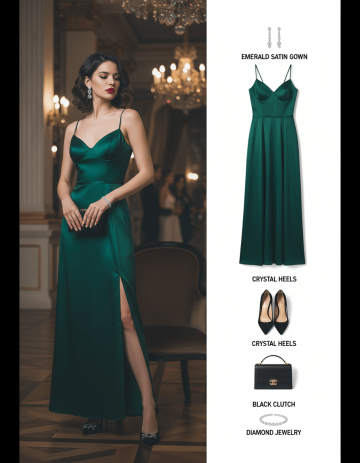 Use uploaded image as reference. Change person into elegant evening party outfit.