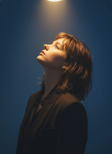 Lighting and Atmosphere: A single, intense, warm golden spotlight shines directly down from above, creating a harsh, chiaroscuro effect. This light perfectly illuminates the face, neck, and throat, contrasting sharply with the deep, enveloping shadow covering the rest of the figure and clothing. The image must be high-contrast and cinematic.