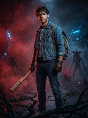 Place them inside the Upside Down world with floating particles, red mist, a dark atmosphere, and eerie blue lighting. Show cracked ground, dark vines, and distant Demogorgon silhouettes. Their outfit should follow an ’80s adventure look: jacket, gloves, backpack, and optionally sunglasses if it fits.