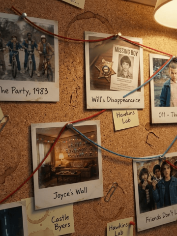 Create an image about "Stranger Things" retold through a series of Polaroid photos pinned to a cork board. Each photo captures a key moment, with simple captions below. Arrange the photos in a loosely chronological path across the board, using colored strings to connect events and characters. Light the scene warmly to evoke nostalgia. Include incidental details, coffee cup rings, paper clips, handwritten notes, for authenticity.