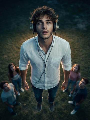 They are wearing retro headphones with natural hanging wires.