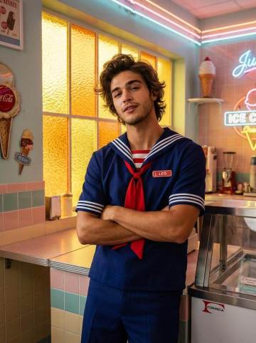 Using the uploaded image as the subject, recreate the scene: a person with medium-length, voluminous hair stands with their arms crossed inside a bright retro ice-cream shop. They wear a navy blue sailor-style uniform with white stripes and a red necktie, along with a name tag on their chest. Behind them is a window with textured glass and warm indoor lighting softly illuminating their face. Their expression is confident and slightly playful, evoking an 80s nostalgic vibe. Render with high-detail skin texture, soft cinematic lighting, and a crisp, colorful retro aesthetic.