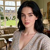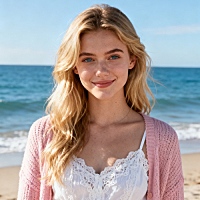 Fixed shot. A gust of wind blows towards the character's face. The character's hair gently flutters backward (the wind is coming from the front). The moment the hair is blown by the wind, it becomes shorter (short hair above the shoulders). The color of the hair does not change. After the hair is shortened, the character looks at the camera and smiles. The character maintains a consistent posture, possessing a cinematic texture and smooth movements.