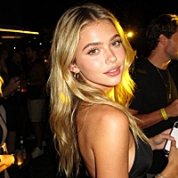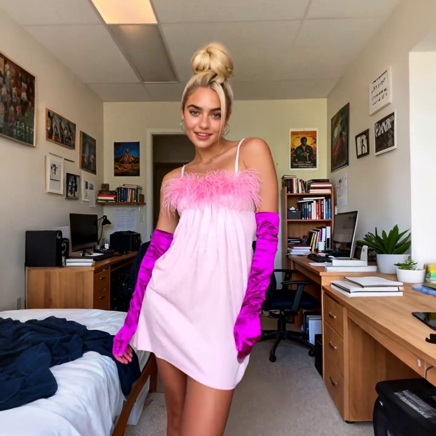 The camera slowly pulls back to a full shot. The character is changing clothes in a dynamic scene (the changing clothes action is quick), and instantly puts on a pink nightgown. Clothing: A loose, sheer, and loose bandeau dress (the dress has a loose and waistless shape, extending above the knees), with pink feathers stitched onto the chest and the hem of the skirt. The chest is full and upright, with elasticity. Key elements: The hair turns into golden big wavy hair + a high bun, wearing bright powder purple gloves. The entire movement has a fast rhythm, and the transition between costume changes has natural action connections without any scene editing. The lighting environment remains unchanged, maintaining the consistency of the character. The costume is displayed to the camera after the transformation.