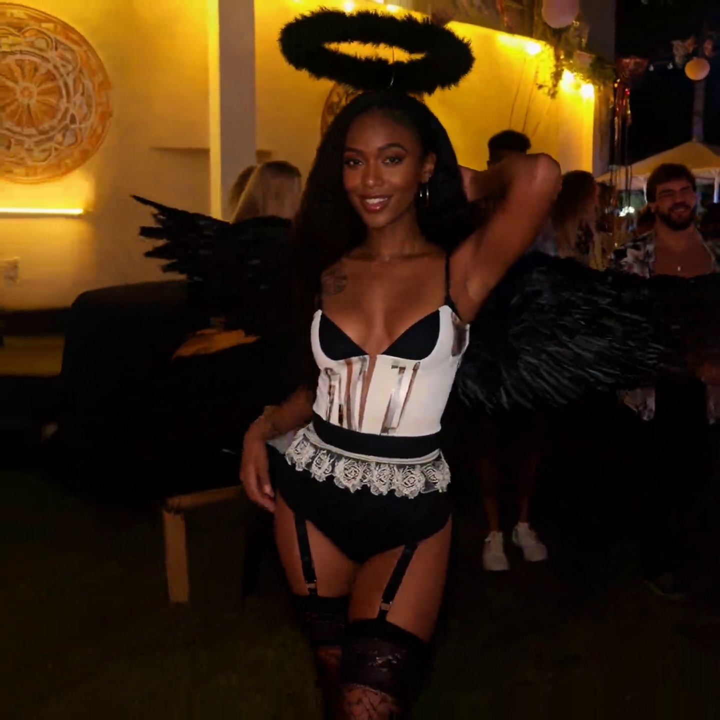 The camera slowly pulls back to a panoramic view. The character performs a graceful turn (the turn is swift) and instantly transforms into a dark and fallen angel costume. The costume is a tight black corset (Corset), with lace trim and drawstring design, Gothic yet sexy black short pants + garter belt (Garter Belt), and a black lace thigh-high stocking with the corset integrated, perfectly outlining the voluptuous and sexy curves, with a full and upright chest, full of elasticity. Key elements: a blood-red pentagram tattoo below the collarbone, a black fluffy angel halo, black feathers on the back, a sweet yet mysterious smile. The entire movement has a fast rhythm, with seamless transition and action connection without a costume change process, and the lighting environment remains unchanged.
