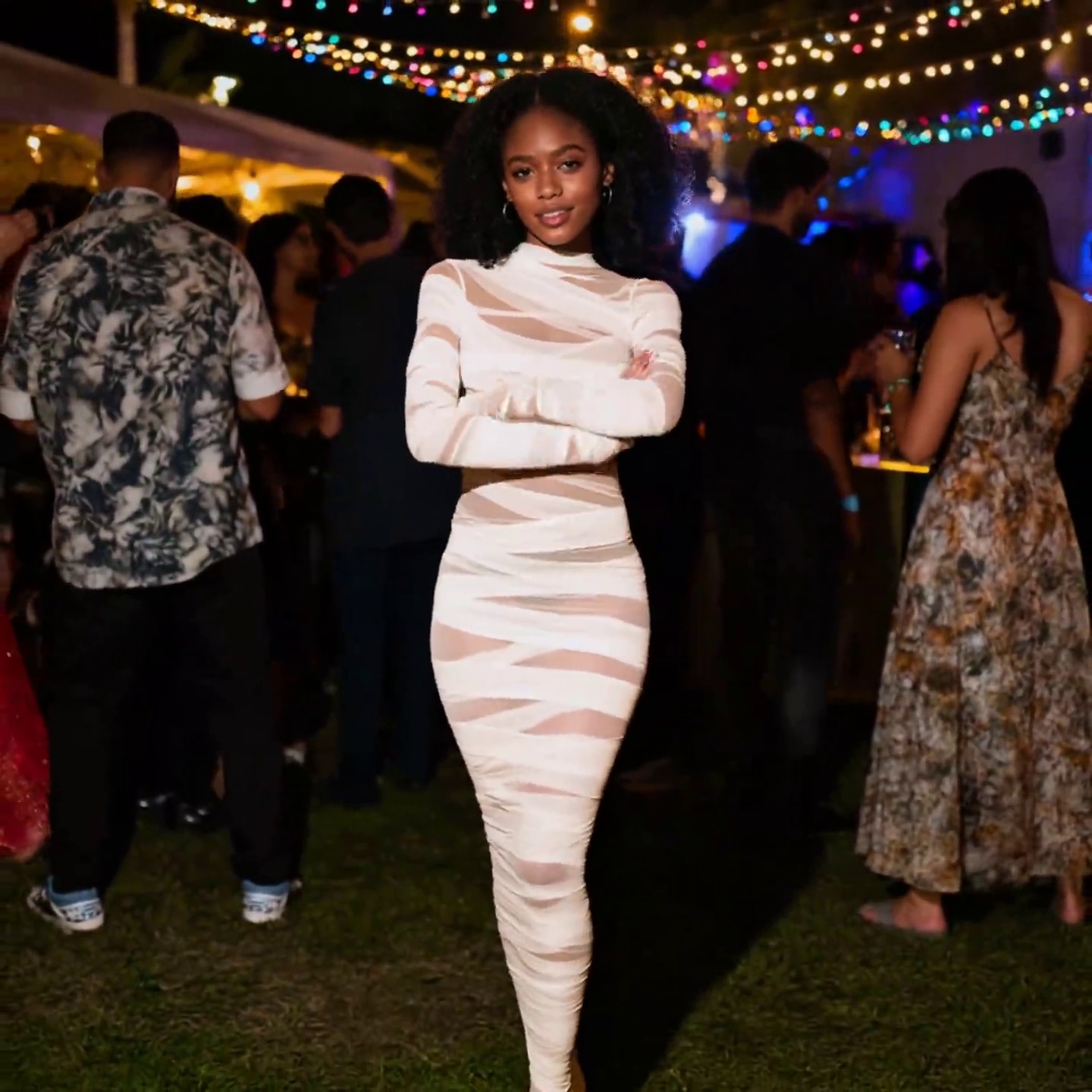 The camera slowly pulls back to a panoramic view (showing the entire character). The character transforms into a new costume in a natural turning motion (the turning action is completed in 0.2 seconds). Instantly, they put on a costume with white translucent bandages wrapped all over their body. Costume: The main element of this costume is the translucent bandages wrapped around. The long-sleeved top is tailored to fit the body shape. Through the cross-wrapping of the mesh bandages, the lower part is a long skirt. It also uses the method of translucent bandages wrapping, extending from the waist all the way to the ankles, closely fitting the leg lines, showcasing the slender leg contours. The legs are crossed, highlighting the figure. Key elements: The translucent bandages interweave and wrap each other, forming unique textures and visual effects. Every detail of the wrapping has been meticulously designed. The entire action has a fast rhythm, without transitions. The transformation process has natural action connections, the lighting environment remains unchanged, maintaining the consistency of the character. The character makes the action of hugging the chest, raises the chin to look at the camera, and shows the overall effect of the character.
