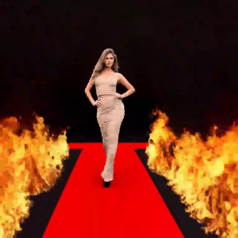 High-quality film-like texture. The camera pulls back from the front to a half-body shot, following the movement of the character. The protagonist quickly changes to a standing position in 0.1 seconds, then takes on the steps of a professional model, with a steady and rhythmic gait. The protagonist's facial expression is cold. During the dynamic changes of the character, the scene naturally transforms into a dark stage background with a red carpet on a T-shaped stage. On both sides of the ground, there are irregularly burning bonfires, and the flames continuously converge towards the center of the T-shaped stage, creating a mysterious and highly visually impactful atmosphere. The overall atmosphere is full of strong drama and visual impact, without any transition or natural change.