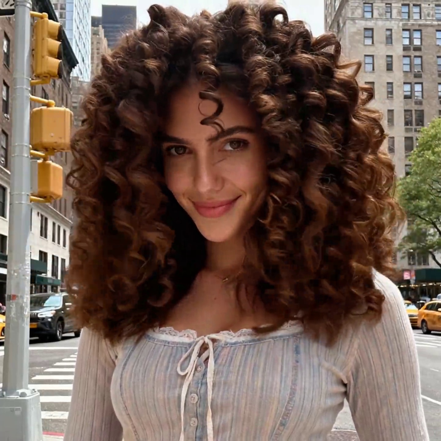 Fixed shot. In 0.1 second, the character's hair suddenly sprouts and transforms into an explosive hairstyle (explosive, expansive, curly with countless small curls) (The change occurs very quickly, completed within 0.1 seconds). The hair color and length remain unchanged. After the hair becomes an explosive hairstyle, the character looks at the camera and smiles. The character maintains consistency, with smooth and continuous movements.