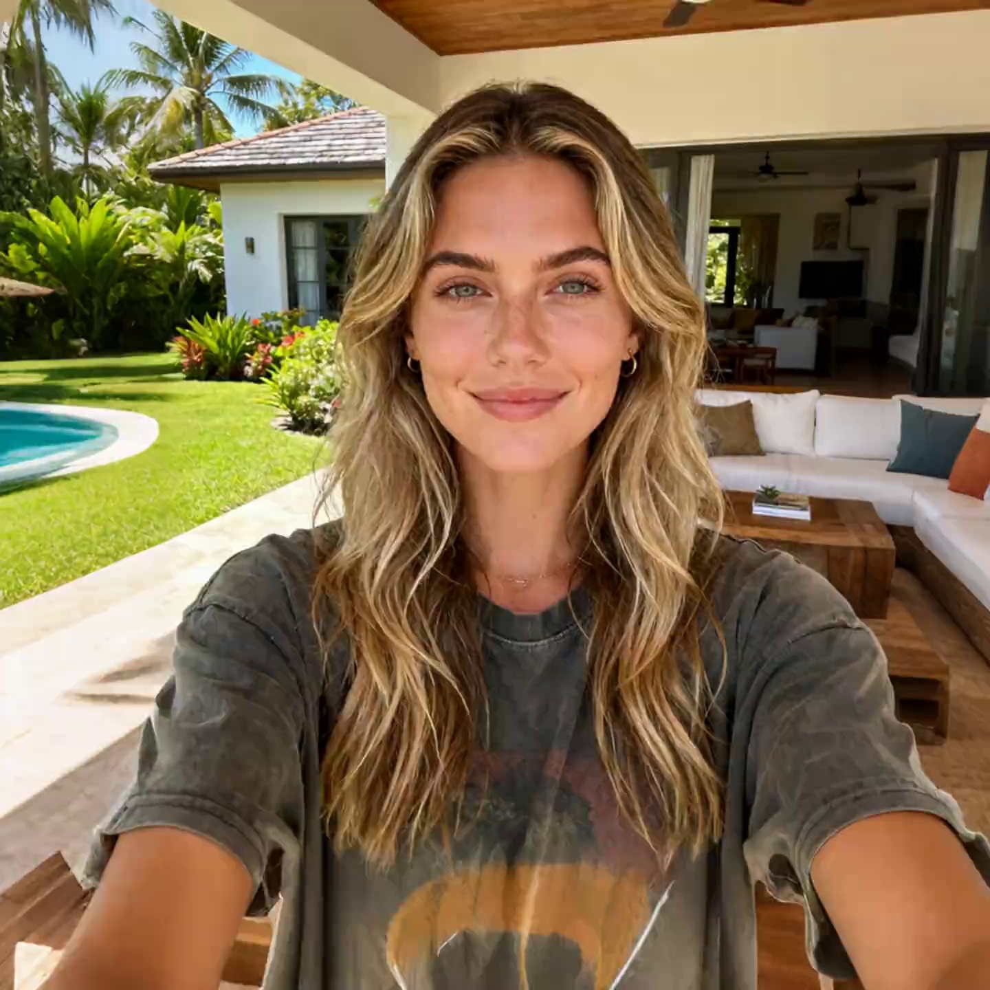 Fixed shot. A gust of wind blows towards the character's face. The character's hair gently flutters backward (the wind is coming from the front). The moment the hair is blown by the wind, it becomes shorter (short hair above the shoulders). The color of the hair does not change. After the hair is shortened, the character looks at the camera and smiles. The character maintains a consistent posture, possessing a cinematic texture and smooth movements.