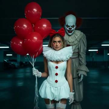 The camera slowly and uniformly pulls back. The camera follows the movement of the characters' faces. The camera always captures the full body of the characters in a panoramic view. The two characters move towards the camera with the same rhythm, walking on the catwalk. The distance between the two remains constant. The clown is always one meter behind the characters, walking in a straight line. The steps have a rhythmic feel, with a delay in the slow motion. The characters look seriously at the camera. A beam of light in front always shines on the characters' faces, keeping the facial lighting always following the characters. The characters maintain clear and bright facial expressions, keeping their faces consistently illuminated. The characters keep walking forward without end.