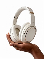 Shot 4: Side close-up in the backlight, the camera pulls back from the ear cushion to the model's face; the head slightly tilts backward, the lips slightly open, the hair is lifted by the gentle wind, the headphones present a soft metallic luster in the backlight (strengthening the atmosphere of "music and nature integration").