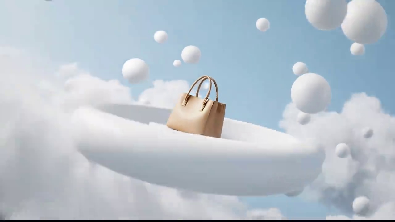 "subject": "The handbag from the user-uploaded image on a white cylindrical pedestal, clouds and white spheres in a light blue sky",