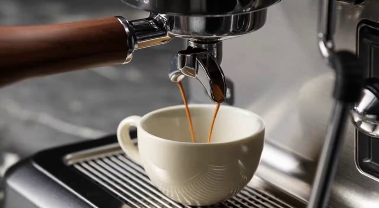 Rich espresso flows into a ceramic cup, detailed crema texture.