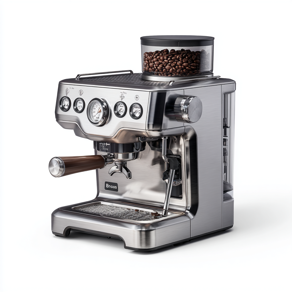 Close-up of steam wand frothing milk in a stainless steel pitcher.