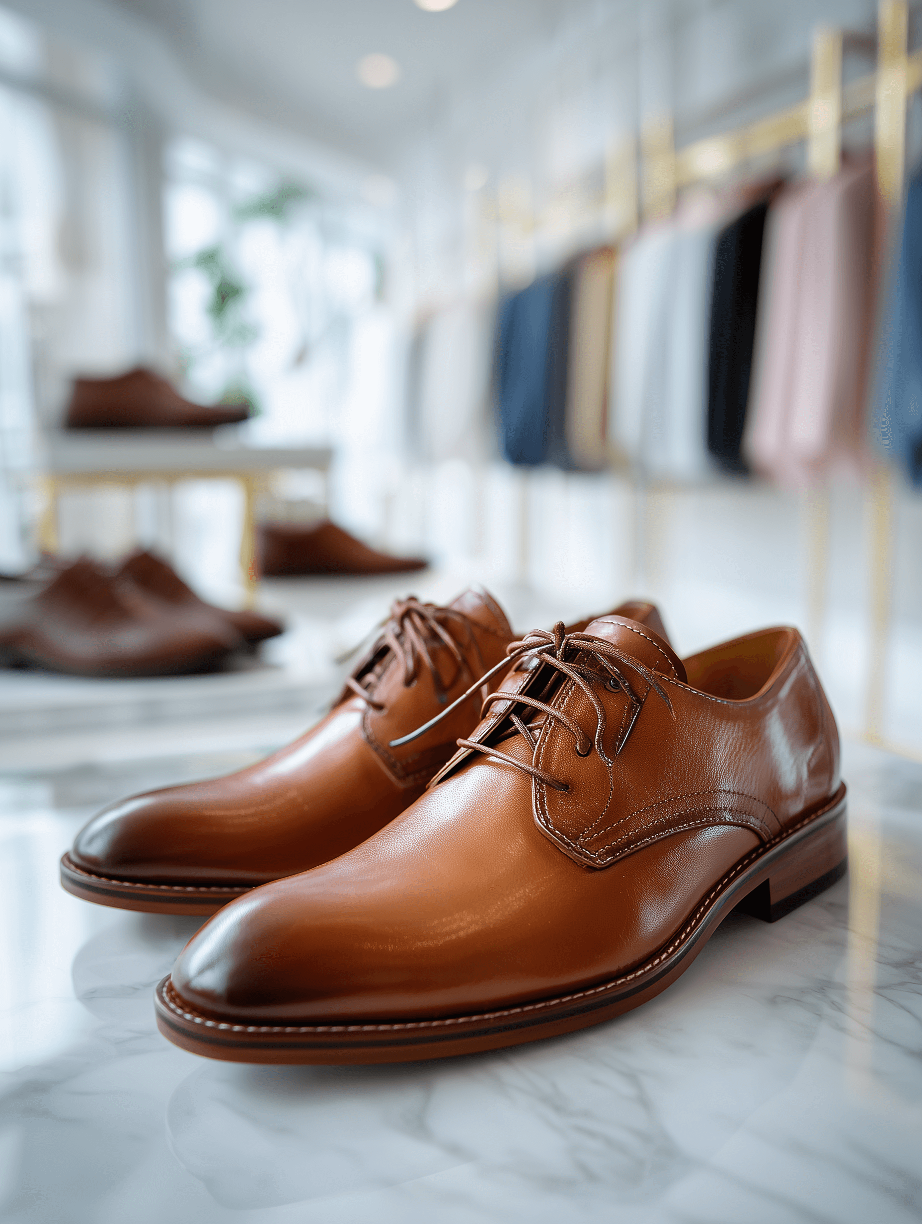 Generate a cinematic commercial video of men's leather shoes, no subtitles. Focus on shoes being worn, showing multiple foot poses and angles: close-ups, side view, top view, 3/4 view, walking and standing shots. If a model appears, use a realistic Western male. Lighting: soft studio lighting emphasizing shoe texture and shine, subtle shadows for depth. Environment: minimal clean studio floor, neutral background, full focus on shoes. Style: high-end commercial, realistic leather textures, smooth transitions, slow-motion shots for elegance. Duration: 10-15 seconds, dynamic camera movement highlighting shoe fit, design, laces, and details. Optional: hands adjusting laces or stepping into frame to enhance realism.