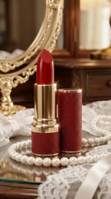 "interaction": "at the end of the shot, a hand wearing black lace glove reaches and picks up the lipstick, taking it out of the frame"