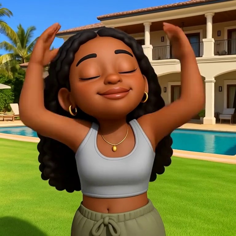 The main subject of the picture comes to life. The protagonist closes their eyes, raises their arms and vigorously touches their head and hair. With eyes closed, they are in an expression of enjoyment. This is a very cute action. After touching their hair, they lower their arms while opening their eyes and making cute movements towards the camera. The expression should be rich, vivid, and natural.
