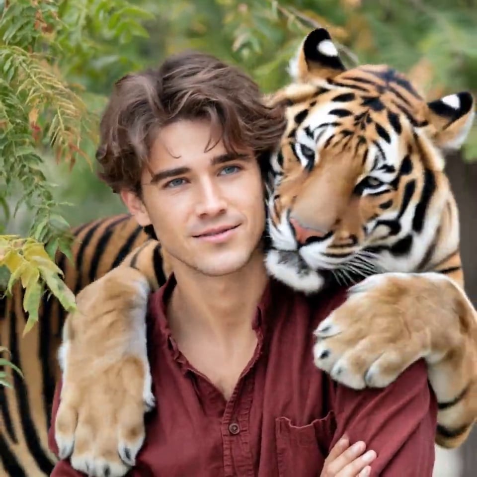 The subject stands still facing the camera. 0.5 seconds later, an adult tiger quietly emerges from behind the subject, moving slowly. 1.0-3.0 seconds: The tiger's front PAWS gently embrace the subject's shoulders and chest, its head is close to the subject's cheek, and its eyes are closed to gently rub against it. The subject maintains a smile, and its hands can gently stroke the tiger's claws. 3.0-4.0 seconds: Maintain the hugging posture, waggle your tail gently, and create a warm atmosphere. There should be no roars, no attacks, and no bloodstains throughout the process.