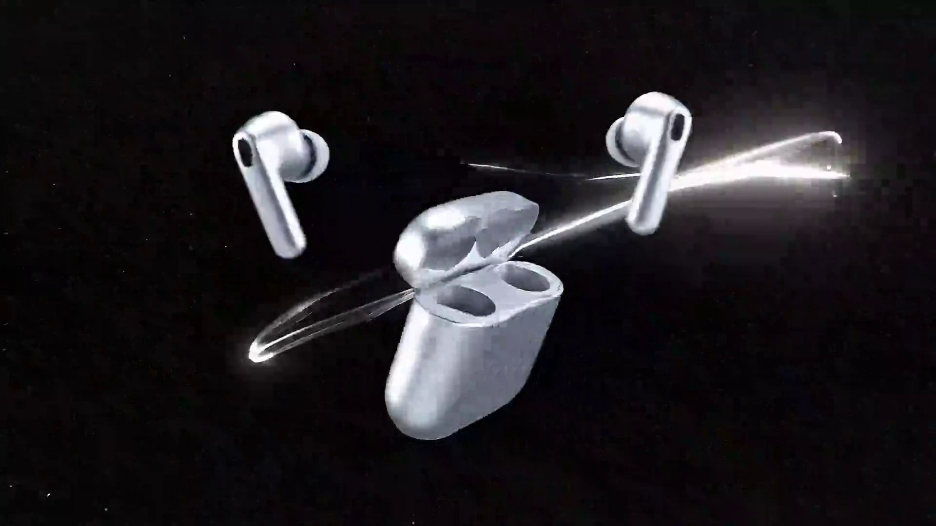 "visual": "The user-uploaded earbuds appear in flashes over a black void. Each flash reveals an angle: top, side, front. Particles burst with light impact.",
