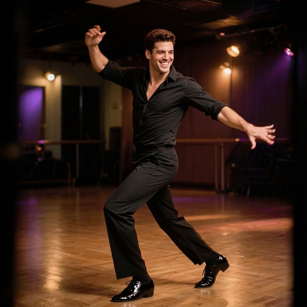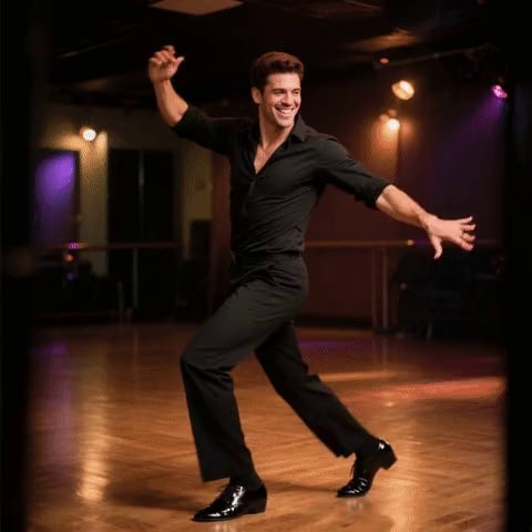 In the center of the picture is a dancer in a Latin dance costume, standing in front of a simple dance studio background, performing the standard cha-cha. Ta's movements start with the basic steps: take a step to the left with the left foot (slow), follow with the right foot in parallel (slow), and then take two more rapid steps to the left with the left foot (quick), creating a "cha-cha cha-cha" rhythm. Then, the dancer turns 180 degrees and repeats the same combination of steps. The movements are smooth and the rhythm is lively. The hips swing naturally to the beat, presenting the unique "Guba rhythm" of Latin dance. Fixed lens frontal shooting, stable picture, soft light, clean background, highlighting the dancers' movements and rhythm, creating a passionate, lively and playful atmosphere.
