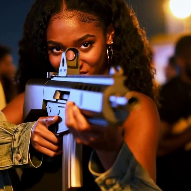 Fixed shot. The subject sneers (with the corners of the mouth raised), steps back one step, takes out a modern black metal assault rifle from below, only the exposed eyes, with a focused and somewhat cold gaze, the line of sight extending through the scope of the gun (the gun is shown partially sideways, revealing the entire body of the gun). The gun is in a continuous firing state, the muzzle constantly emitting bright and diffused flames, with high brightness and a wide range, presenting an explosive visual effect.