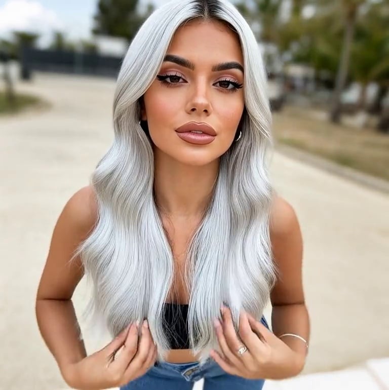 Fixed shot. The protagonist's eyes are fixed on the camera. The protagonist raises both hands and uses them to touch his own hair (from top to bottom). At the moment when he touches the hair, the hair begins to change along with his hands. The hair starts to turn silver-white from the roots. Only the color of the hair changes, the hairstyle remains unchanged. The movement is smooth.