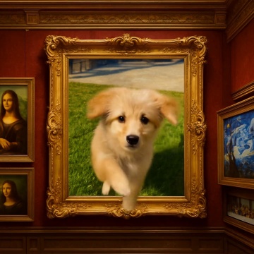 Fixed shot. The main character in the visual center of the picture quickly jumps out of the frame, the process is rapid and does not affect the background, runs to the real world, runs towards the camera, looks at the camera, runs up to the camera and stops, maintaining the consistency of the main subject, the background remains unchanged, and the scene within the frame remains unchanged.