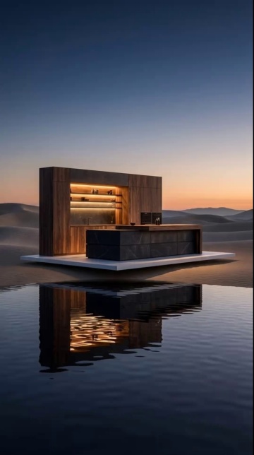 "subject": "A modern kitchen with an island and cabinetry on the left, and a rocky stream flowing through a misty, natural environment on the right.",